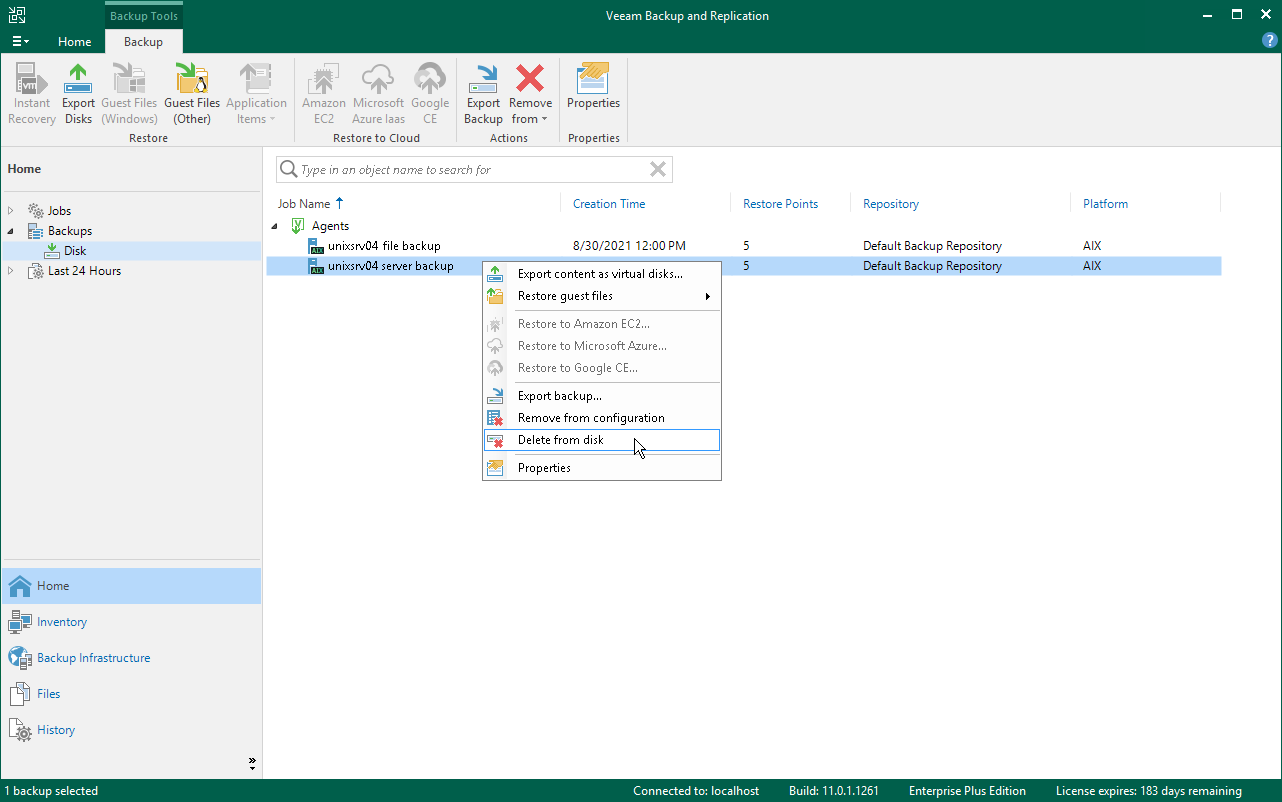 When you remove a Veeam Agent for IBM AIX backup from the Veeam backup repository, Veeam Backup & Replication deletes all records about the backup from its database and console. The actual backup files are removed from the backup repository, too.