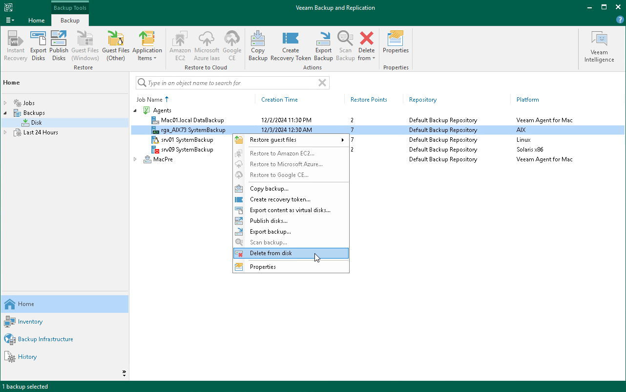 3. Select the necessary computer backup and click Delete from > Disk on the ribbon or right-click the computer and select Delete from disk.