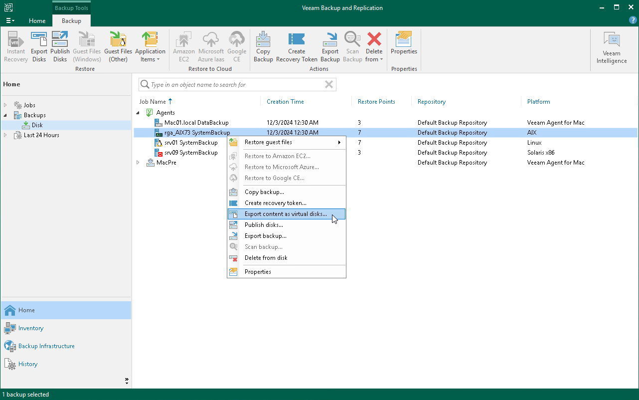 - Open the Home view. In the inventory pane, click the Backups node. In the working area, expand the necessary Veeam Agent backup, select the necessary computer in the backup and click Export Disks on the ribbon or right-click a computer in the backup and select Export content as virtual disks.