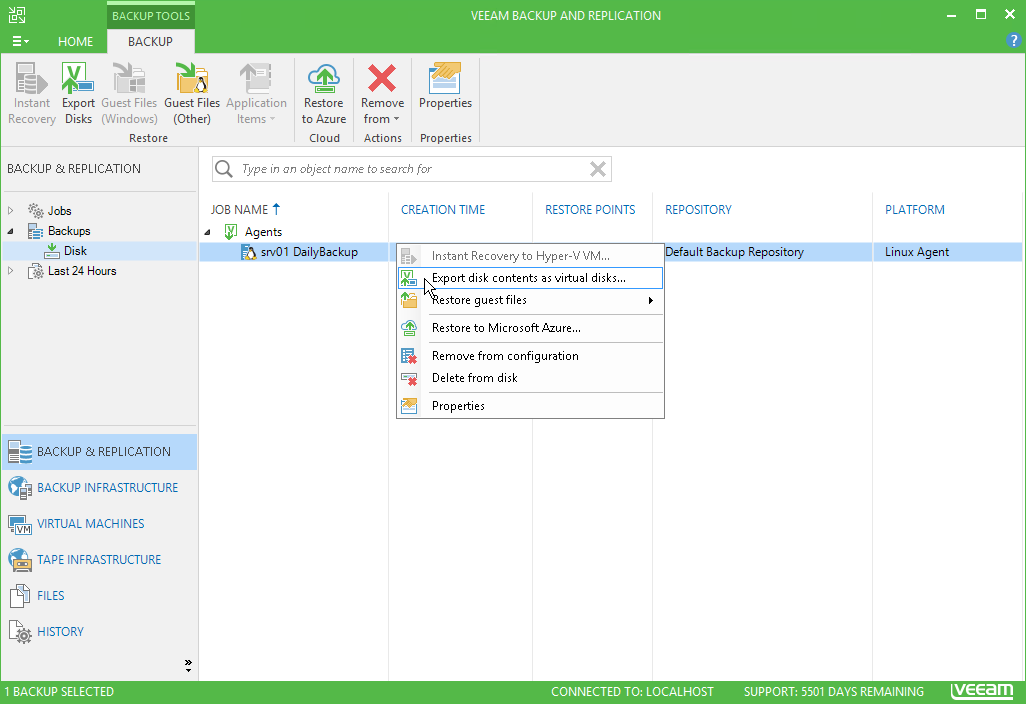 - In the inventory pane, click Disk under the Backups node. In the working area, expand the Agents node, right-click the necessary backup and select Export disk contents as virtual disks. You will pass to the Restore Point step of the wizard.