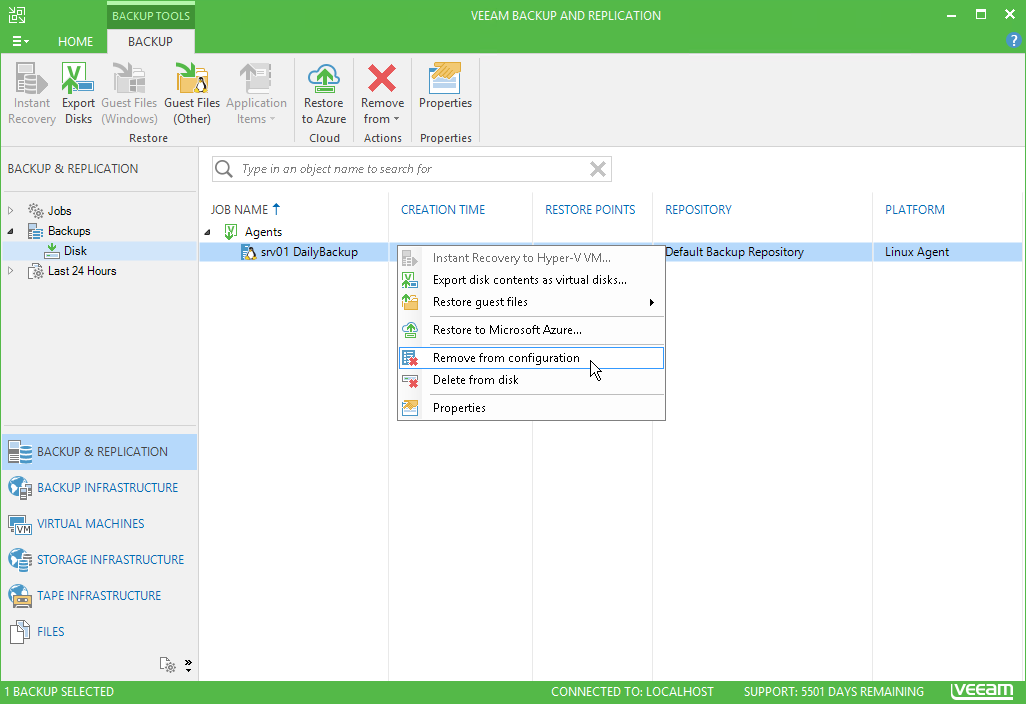 When you remove a Veeam Agent for Linux backup from configuration, Veeam Backup & Replication deletes all records about the backup from its database and console. The actual backup files remain on the backup repository. You can import the backup to the Veeam Backup & Replication at any time later and restore data from it. To learn more, see Importing Veeam Agent for Linux Backups.