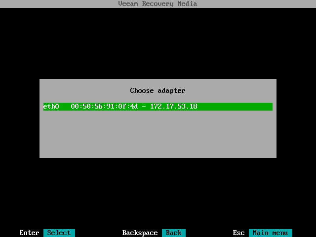 1. In the Choose adapter list, select the network adapter that you want to use to connect to the network shared folder or Veeam backup repository where the backup resides and press Enter.