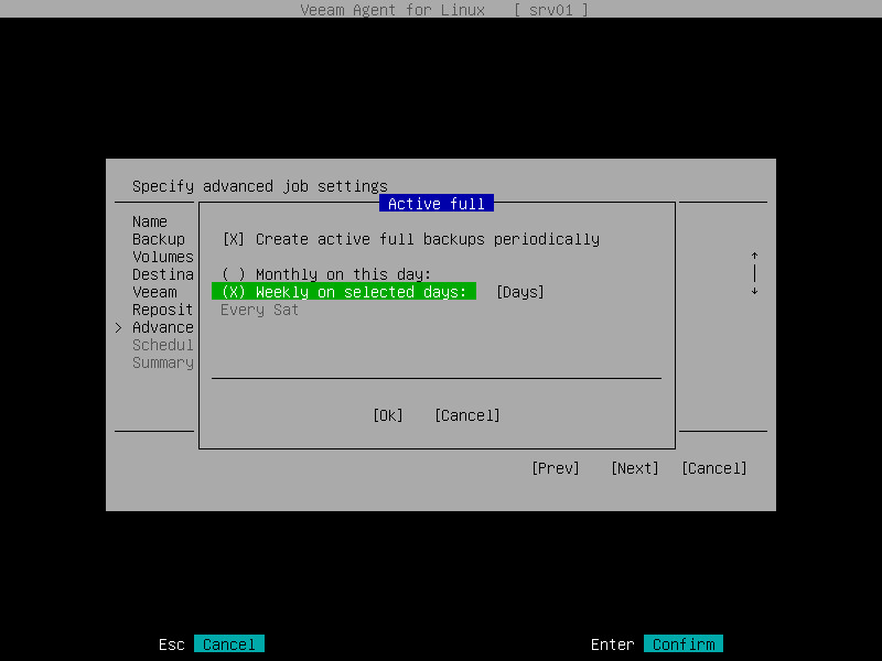 - In the Days window, specify days on which Veeam Agent will perform active full backup. By default, Veeam Agent performs active full backup every Saturday. To select days, use Up, Down, Right, Left and Space keys.