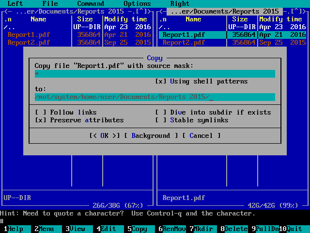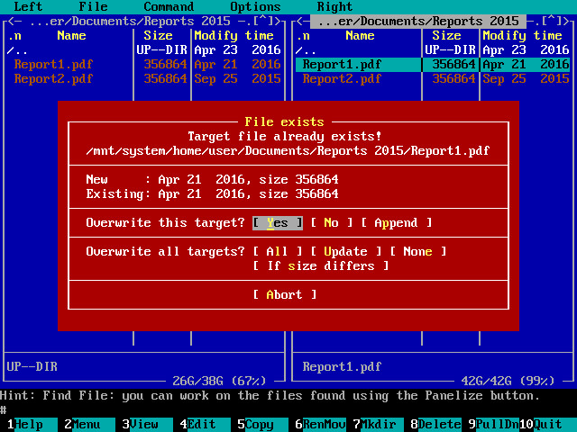 1. If the file or folder you want to restore exists in its original location, Midnight Commander will display a warning. In the warning window, select the necessary operation with the target file or folder and press Enter. Midnight Commander will save the file or folder in its original location.