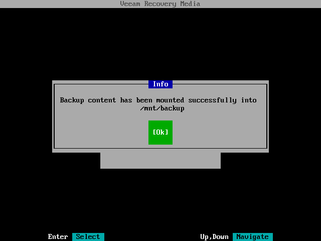 1. Veeam Agent will mount the content of the backup file to the /mnt/backup directory in the recovery image OS file system and display a notification window with the corresponding message. Press Enter to proceed to the File Level Restore wizard menu, open the file manager and save restored files.