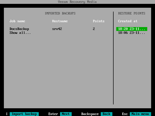1. In the Imported backups pane, ensure that the backup from which you want to recover data is selected and press Enter.