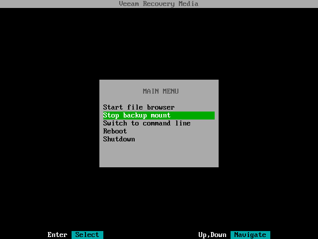 To stop the backup mount session with the Veeam Recovery Media, in the File Level Restore wizard menu, select the Stop backup mount option and press Enter. Veeam Agent will stop the backup mount session, unmount the backup from the /mnt/backup directory of the recovery image OS file system, exit the File Level Restore wizard and display the Veeam Recovery Media main menu.