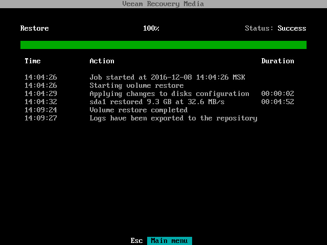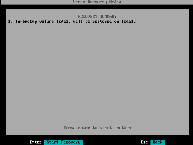 - Press Enter to start the volume-level restore process. Veeam Agent for Linux will perform partition re-allocation operations if necessary, restore the necessary data from the backup and overwrite data on your computer with it.