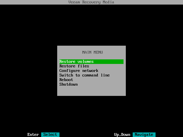 To launch the volume restore wizard, in the Veeam Recovery Media main menu, select Restore volumes and press Enter.