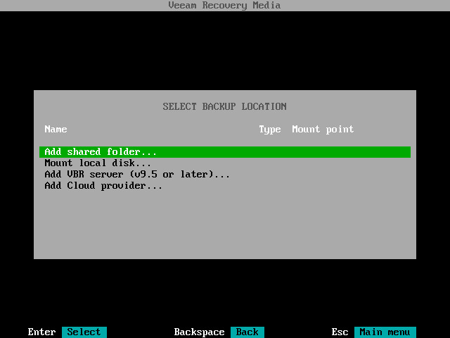 - Add shared folder — select this option if the backup file is located in a network shared folder. With this option selected, you will pass to the Mount shared folder step of the wizard.