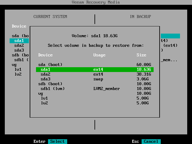 1. Veeam Agent for Linux will display a window with a list of volumes in the backup. Select the volume that you want to restore and press Enter.