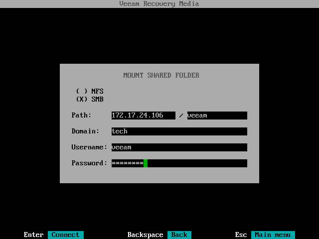 - Press Enter to connect to the network shared folder. Veeam Agent will mount the specified network shared folder to the /media directory of the recovery image OS file system and display content of the network shared folder.
