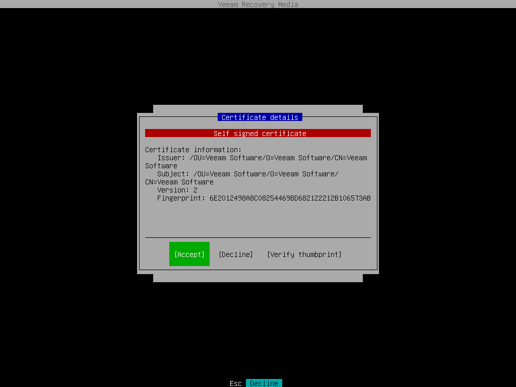 - Switch to the Verify button and press [Enter]. Veeam Agent for Linux will check if the thumbprint that you entered matches the thumbprint of the obtained TLS certificate.