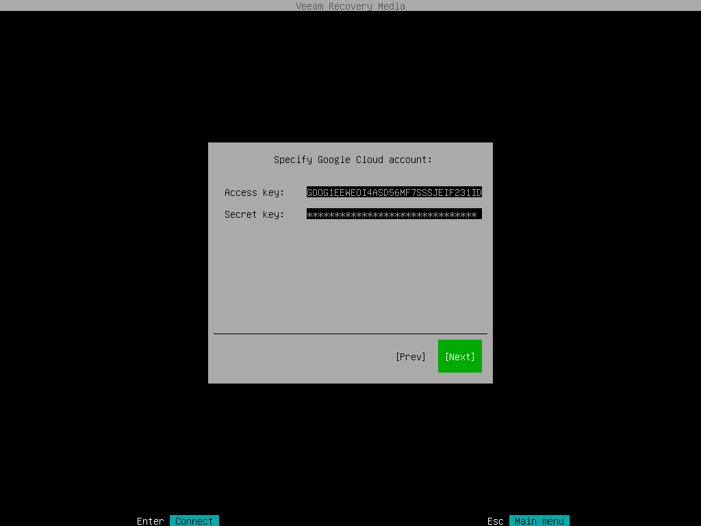 To connect to the Google Cloud storage, in the Access key and Secret key fields, specify the Hash-based Message Authentication Code (HMAC) key associated with the Google Cloud account. Veeam Agent will use the HMAC key to authenticate requests to the Google Cloud storage. For more information on Google Cloud accounts, see the Google Cloud documentation.