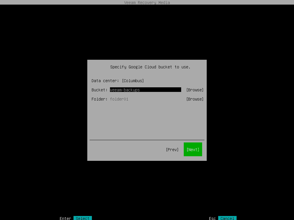 The Bucket step of the wizard is available if you have chosen to import backup from a Google Cloud storage repository and specified account settings to connect to the storage.