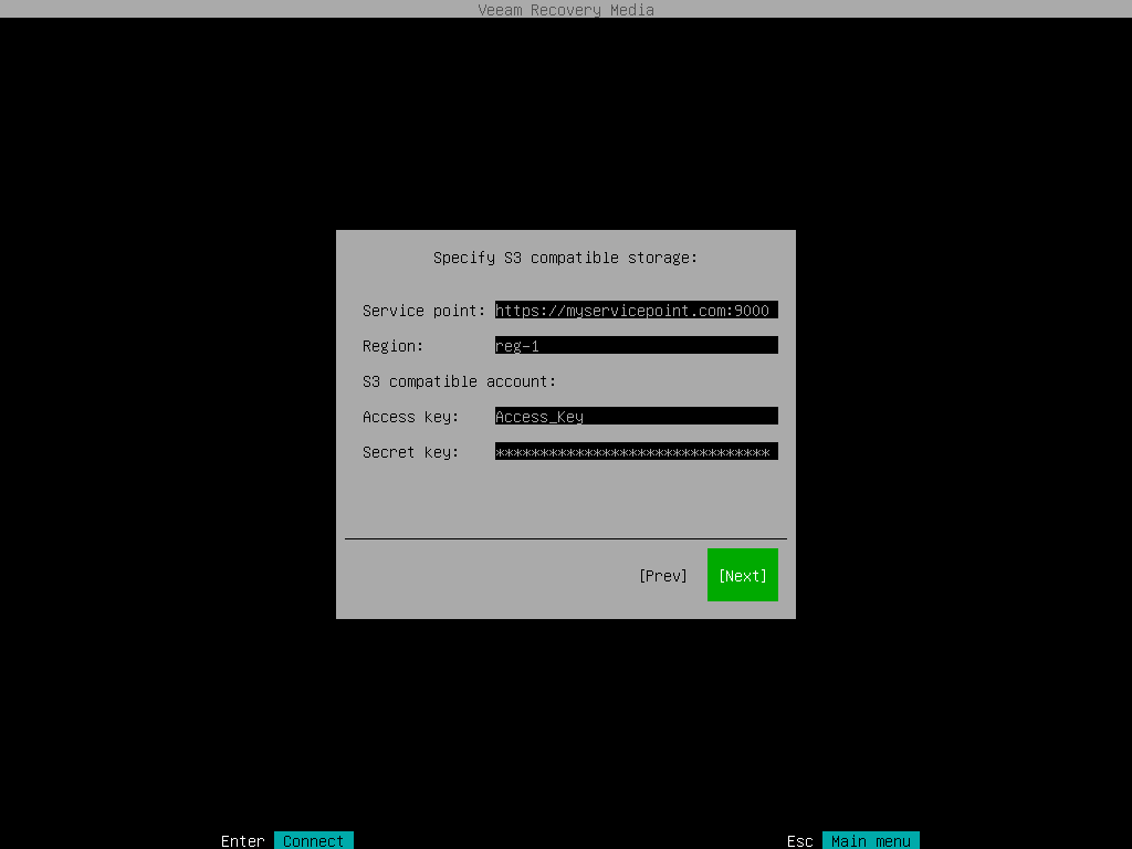 To connect to the S3 compatible storage, specify the following: