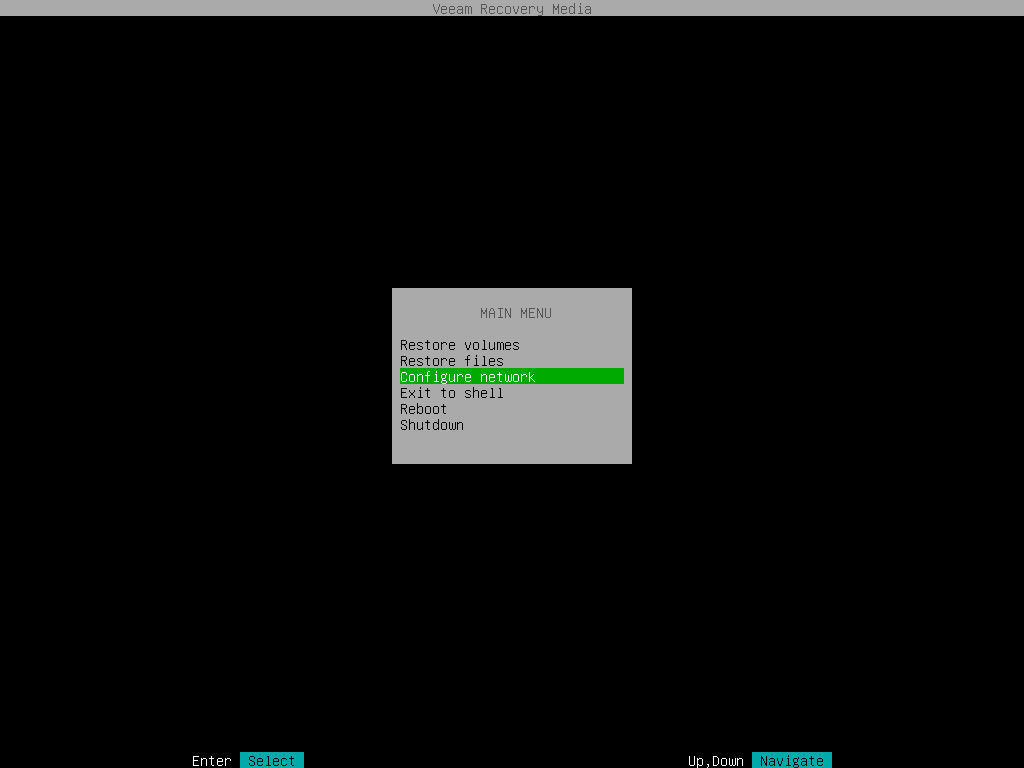 - In the Veeam Recovery Media main menu, select Configure network and press [Enter].