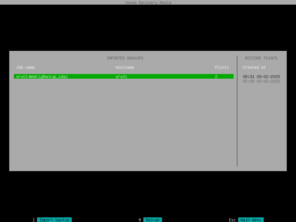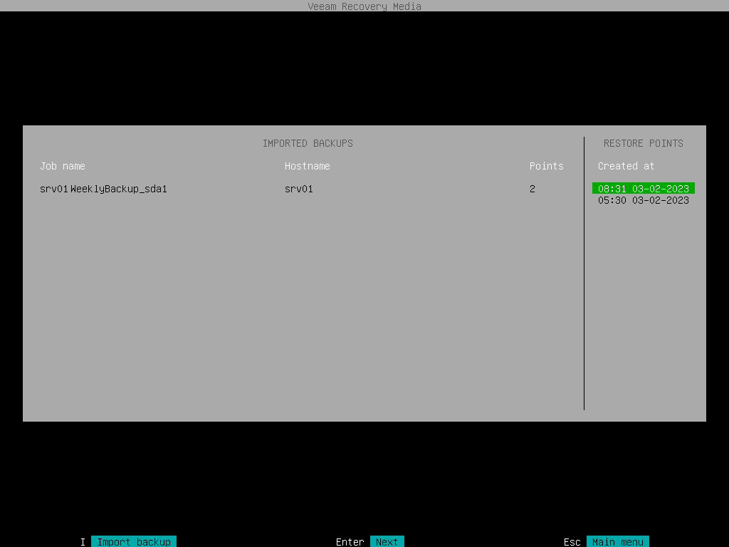 - In the Imported backups pane, ensure that the backup from which you want to recover data is selected and press [Enter].