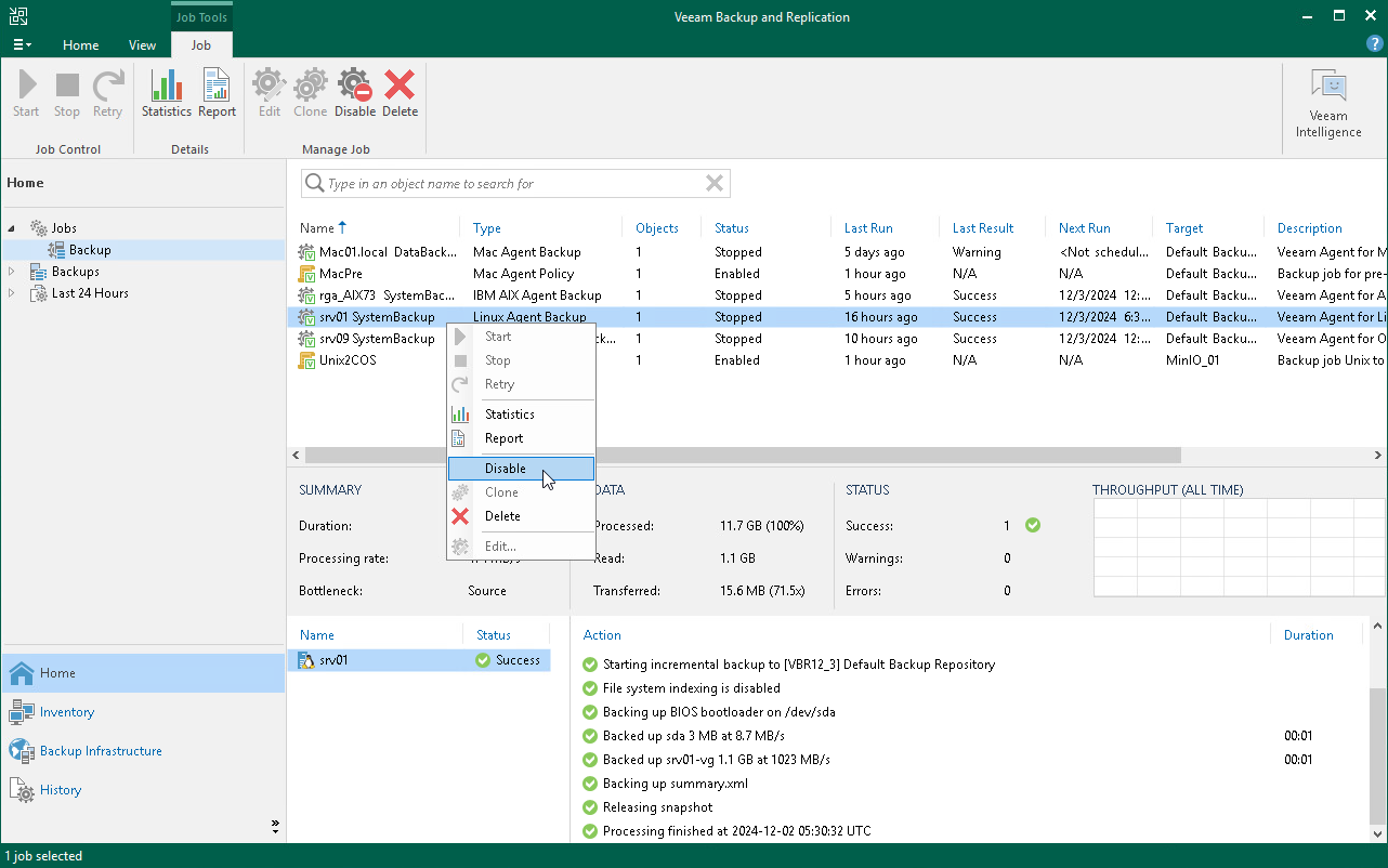 3. Select the necessary job in the working area and click Disable on the ribbon, or right-click the necessary job in the working area and select Disable. To enable the disabled job, click Disable on the toolbar, or right-click the job and select Disable once again.
