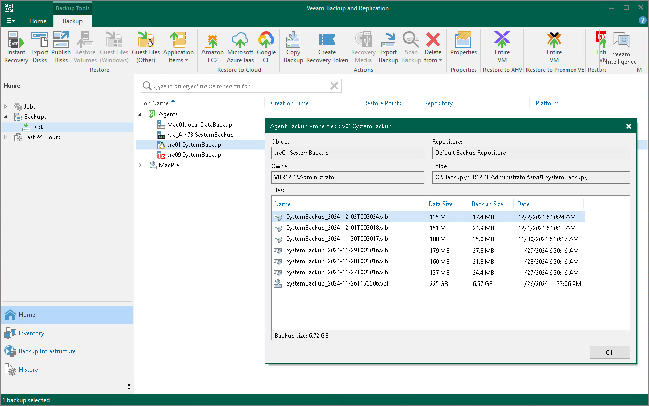 - In the working area, expand the Agents node, select the necessary backup and click Properties on the ribbon, or right-click the backup and select Properties.