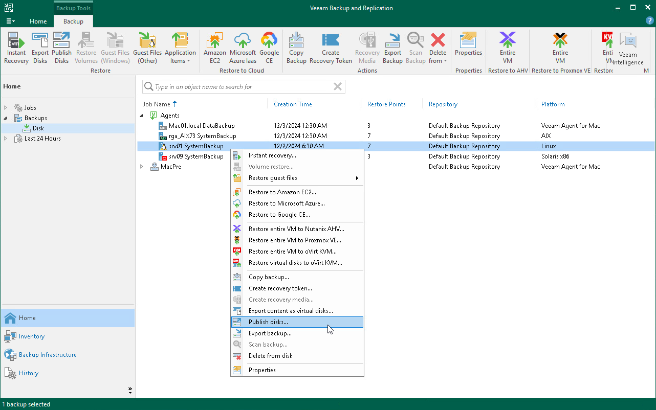 • Open the Home view. In the inventory pane, click Backups. In the working area, expand the necessary Veeam Agent backup, select a computer whose disks you want to publish and click Publish Disks on the ribbon. Alternatively, you can right-click the computer and select Publish disks. In this case, you will proceed to the Restore point step of the wizard.
