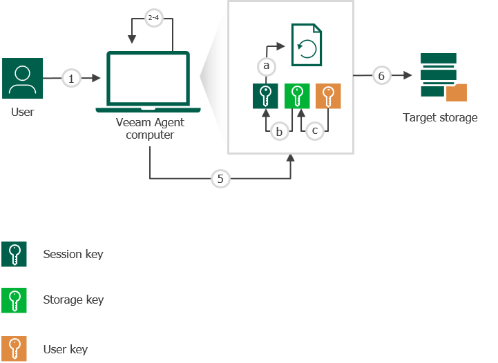 - Veeam Agent creates a session key and a metakey. The metakey is stored to the Veeam Agent database.