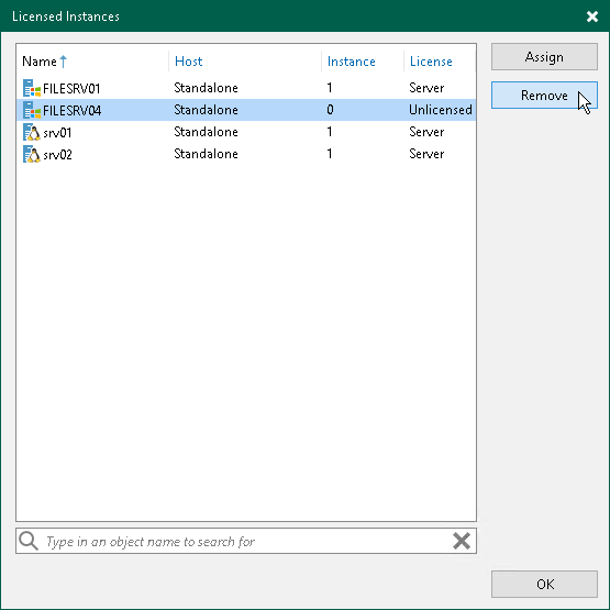 The Veeam Agent from which you have revoked the license will become unable to connect to the Veeam backup server but will remain in the Licensed Instances list. To allow this Veeam Agent to create backups in the Veeam backup repository, select the Veeam Agent and click Remove. During the next backup job session, the Veeam Agent will connect to the Veeam backup server and start consuming the license.