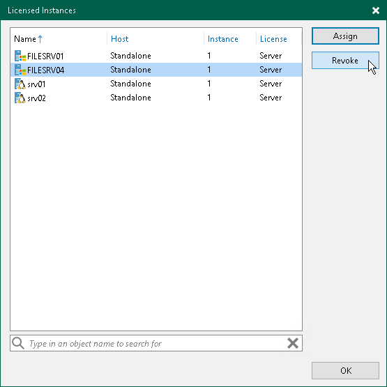 - In the Licensed Instances window, select the Veeam Agent from which you want to revoke the license and click Revoke. Veeam Backup & Replication will revoke the license from the Veeam Agent, and the license will be freed for other workloads protected with Veeam Backup & Replication.