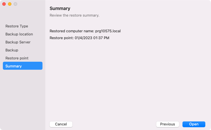 This is an archive version of the document. To get the most up-to-date information, see the current version. Step 7. Complete Import Process At the Summary step of the wizard, complete the procedure of backup import.Review the settings of the import process.Click Open. Veeam Agent will retrieve the content of the backup file and display it in the Veeam Backup browser.