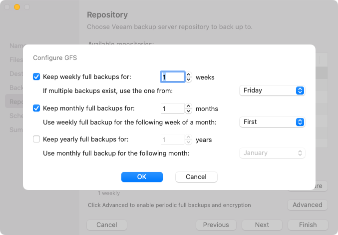 In the Use monthly full backup for the following month list, select a month when Veeam Agent must assign the yearly GFS flag to a full restore point.