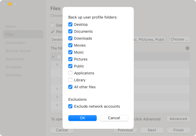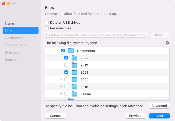 At the Files step of the wizard, you must specify the backup scope — define what folders with files you want to include in the backup.
