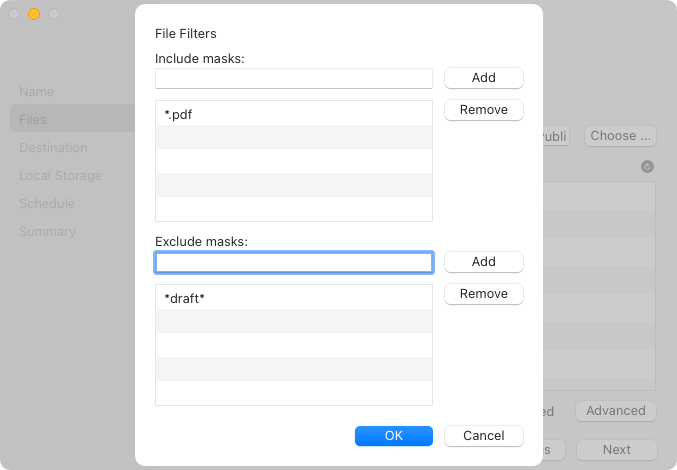 You can specify file name masks for files or file types that you want to include or exclude in/from the backup. To do this: