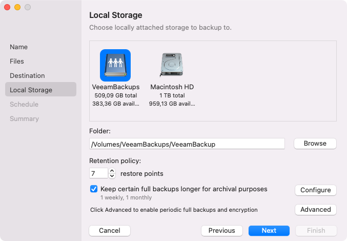 The Local Storage step of the wizard is available if you have chosen to save the backup to a folder on a local drive of your computer.