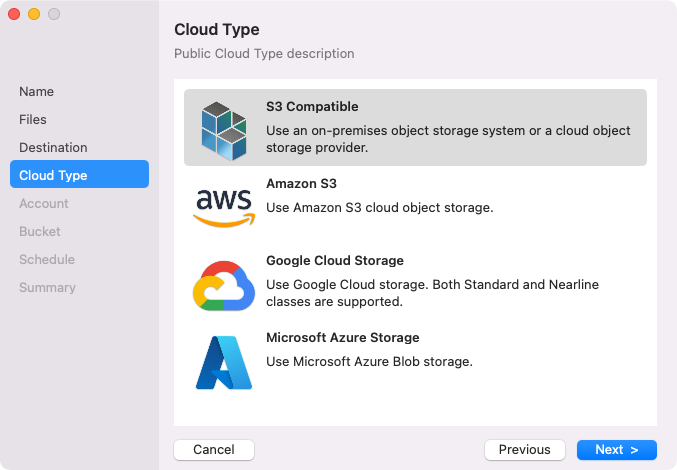 At the Cloud Type step of the wizard, select the cloud storage. You can select one of the following options: