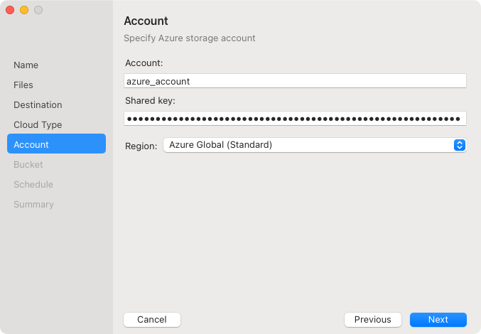 The Account step of the wizard is available if you have chosen to save backup files on a Microsoft Azure storage.