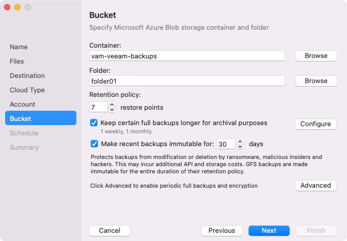 The Bucket step of the wizard is available if you have chosen to save backup files on a Microsoft Azure storage and specified account settings to connect to the storage.