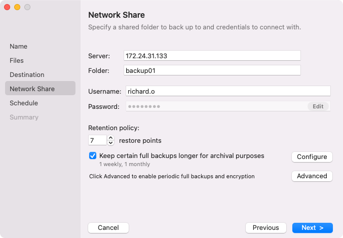 The Network Share step of the wizard is available if you have chosen to save the backup to a network shared folder.