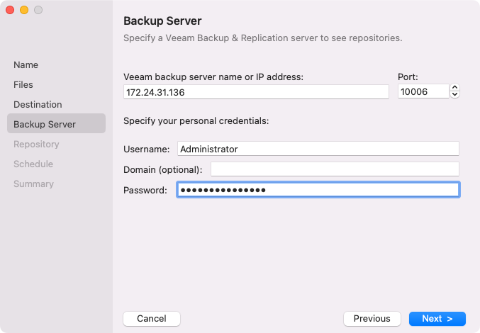 - In the Password field, type a password of the account that has access to the Veeam backup repository.