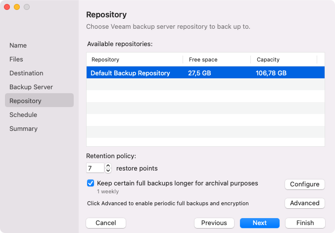 The Repository step of the wizard is available if you have chosen to save backup files on a Veeam backup repository.