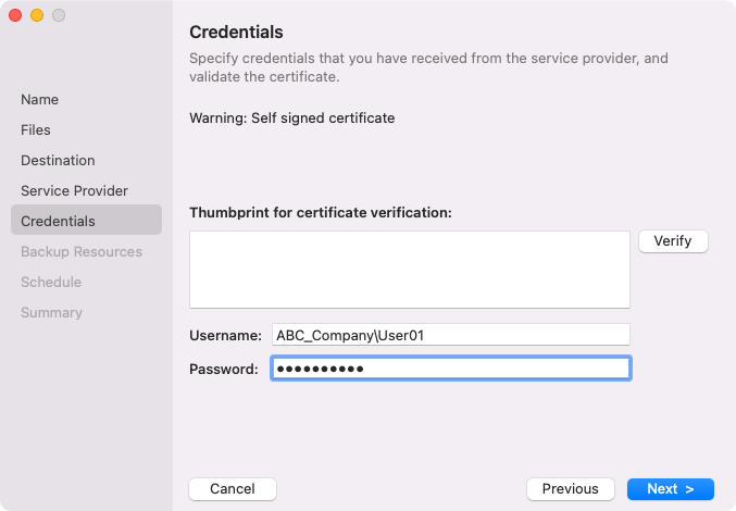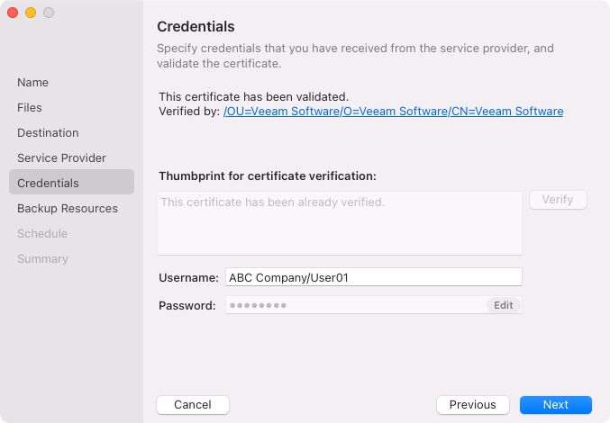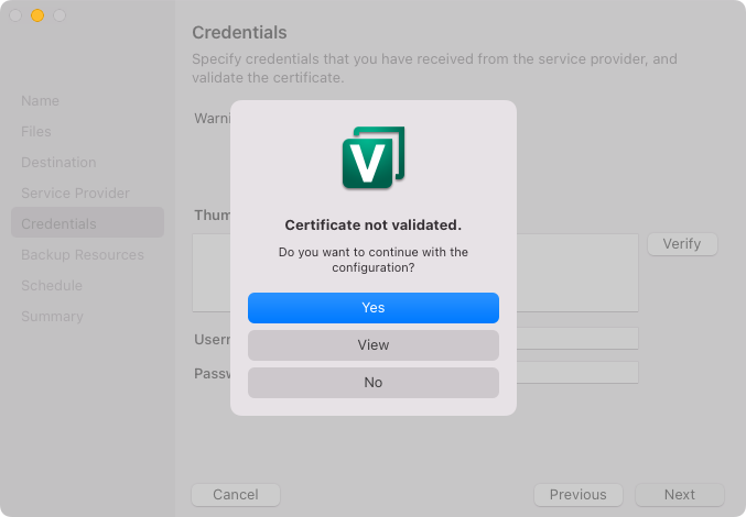 If the certificate has not been verified on the Veeam Agent computer, after you click Next at the Credentials step of the wizard, you will be asked to verify the certificate.