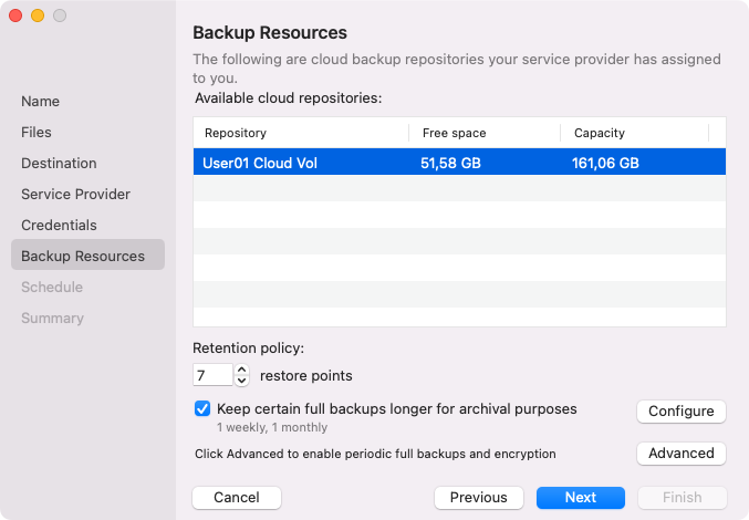 The Backup Resources step of the wizard is available if you have chosen to save backup files on a cloud repository and specified settings to connect to the SP.