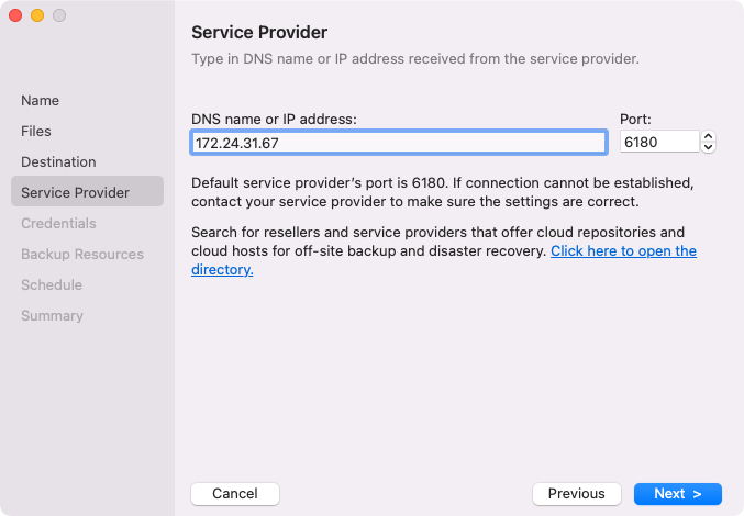 The Service Provider step of the wizard is available if you have chosen to save backup files on a Veeam Cloud Connect repository.