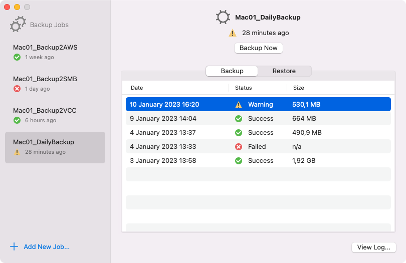 - Select a backup job. In the main pane of the control panel, Veeam Agent will display the list of sessions for the selected backup job.
