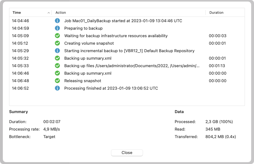 - Click View Log. Veeam Agent will display a window with information on the selected session.