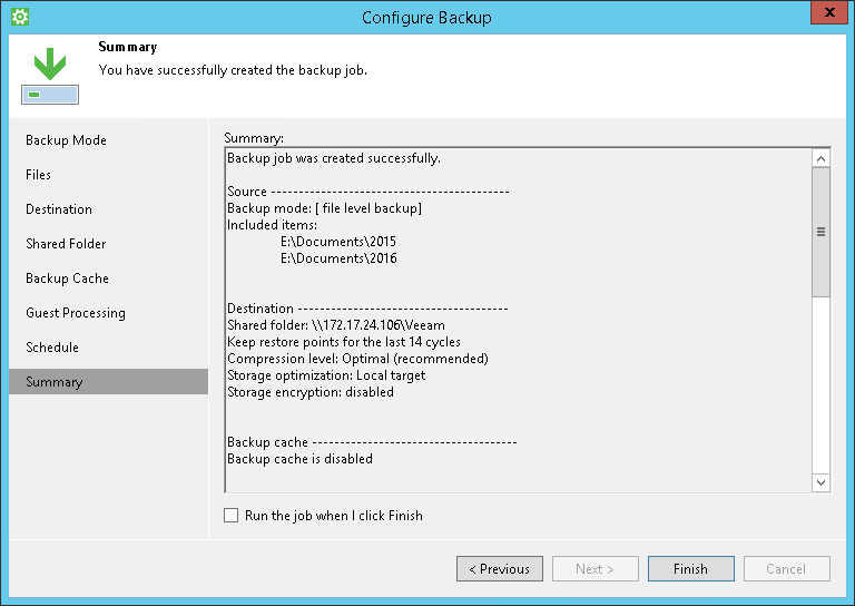 At the Summary step of the wizard, complete the backup job configuration process.