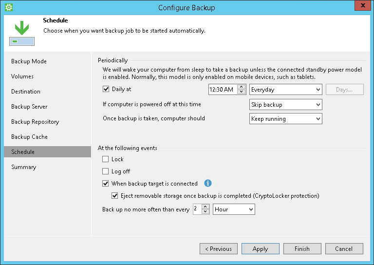 - Select the Eject removable storage once backup is completed check box if you want Veeam Agent for Microsoft Windows to unmount the storage device after the backup job completes successfully. With this option selected, backup files on the removable storage will be protected from encrypting ransomware, such as CryptoLocker.