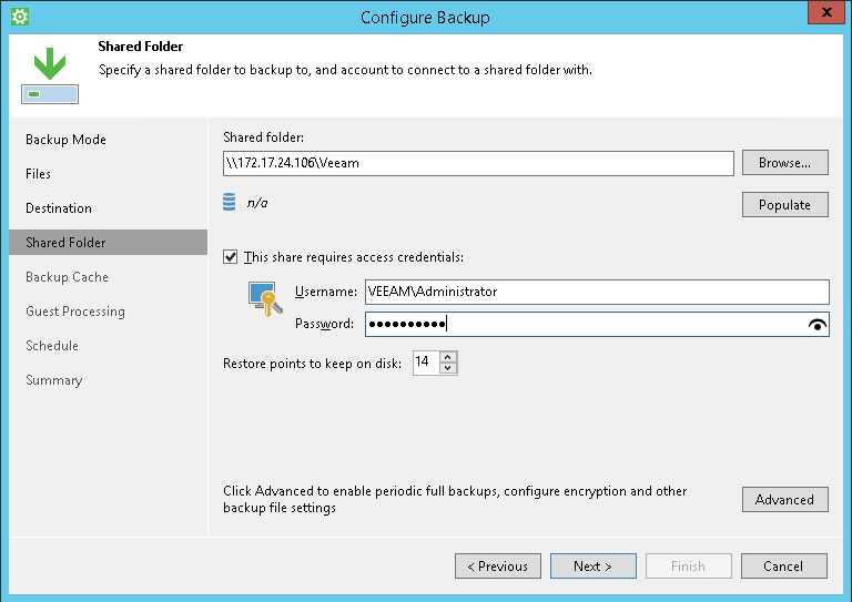 The Shared Folder step of the wizard is available if you have chosen to save the backup in a network shared folder.