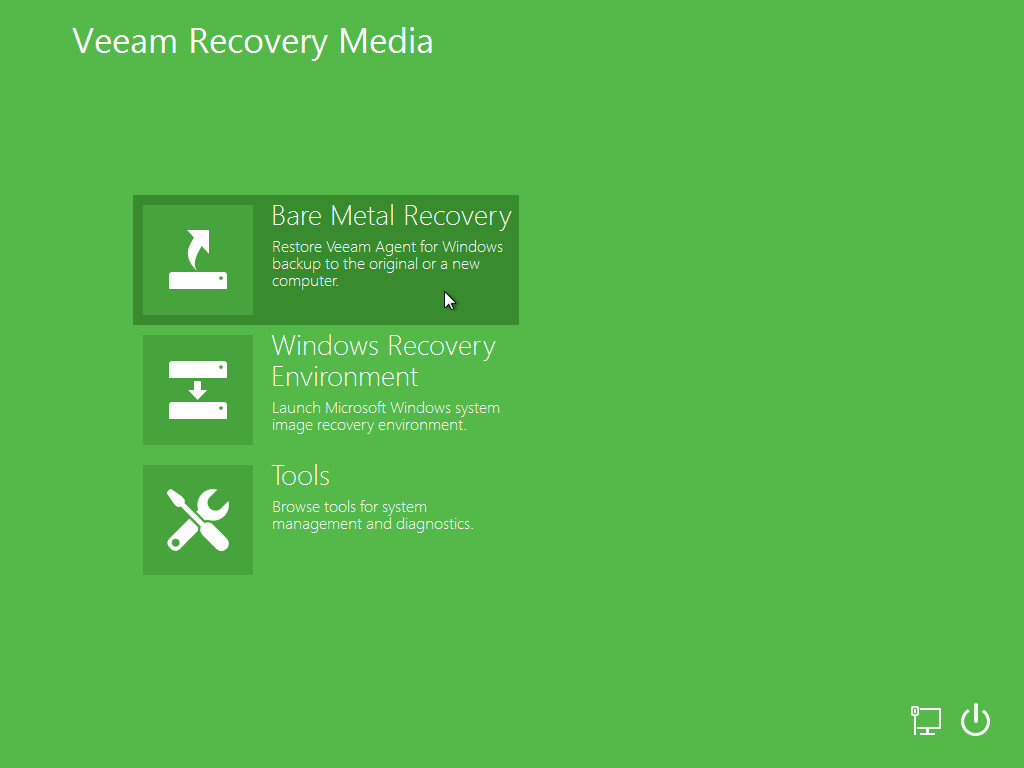 To launch the Veeam Recovery Media wizard, on the Veeam Recovery Media screen, click Bare Metal Recovery.