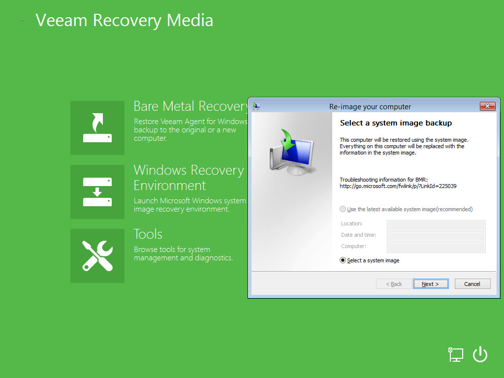 To access the Microsoft Windows System Image Recovery tool, on the Veeam Recovery Media screen, click Windows Recovery Environment.