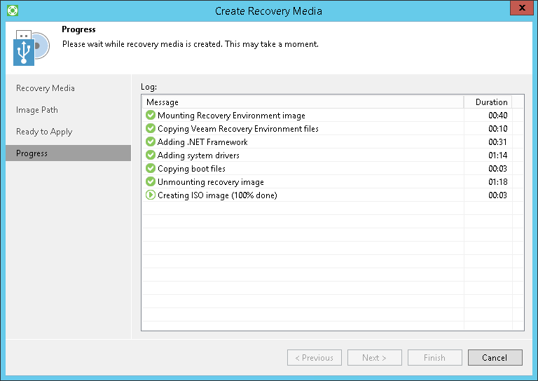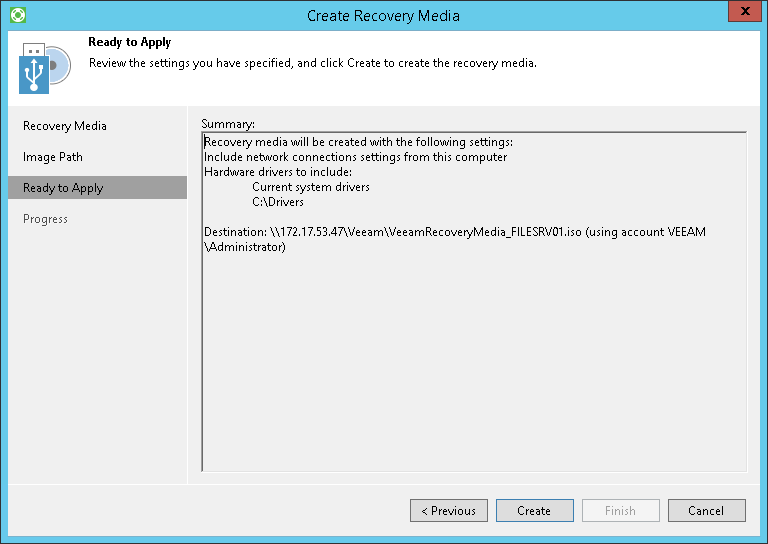 Veeam Agent for Microsoft Windows will collect files necessary for recovery image creation and write the resulting recovery image to the specified target or burn it to CD/DVD/BD.